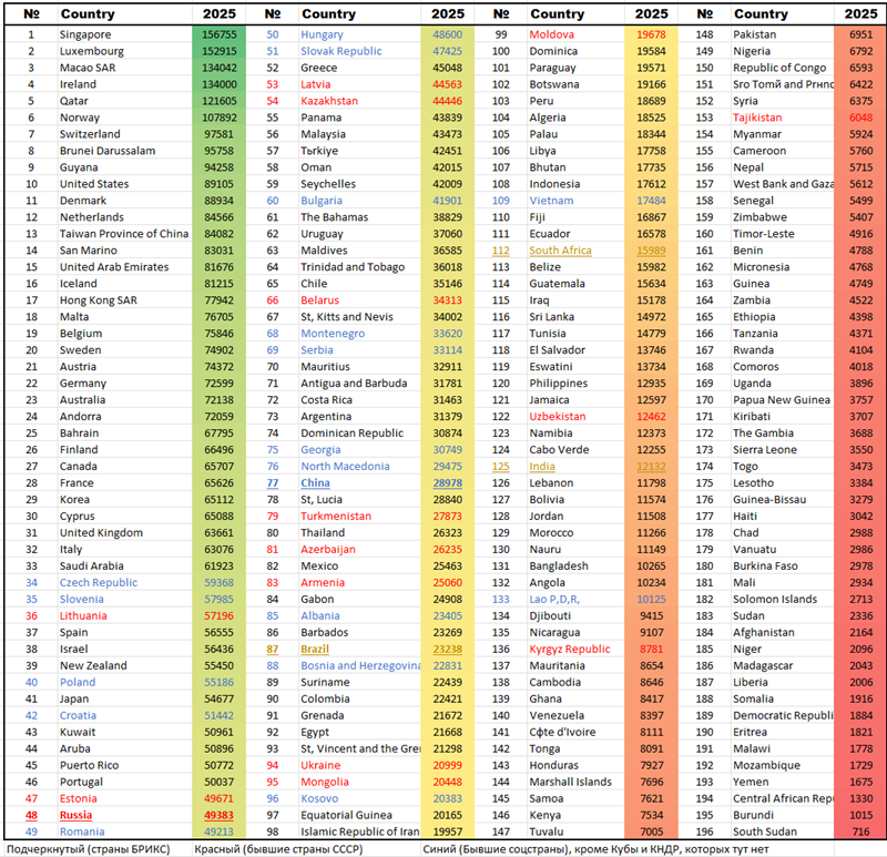 По данным другого источника, мы занимаем 48-е место, но все также обгоняем и Венгрию и Словакию и Грецию и Казахстан. Украина, кстати, по этим данным находится на 94-месте (21 тыс. $), примерно на одном уровне с Монголией, Египтом и Косово: