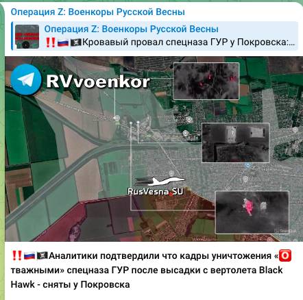 Кадры предполагаемого уничтожения спецназа Главного управления разведки (ГУР) на западной окраине Красноармейска также подтвердили украинские OSINT-аналитики. Отмечается, что они вычислили точки (среди них фигурирует АЗС), на которых с вертолета UH-60A Black Hawk высадились военные ГУР.